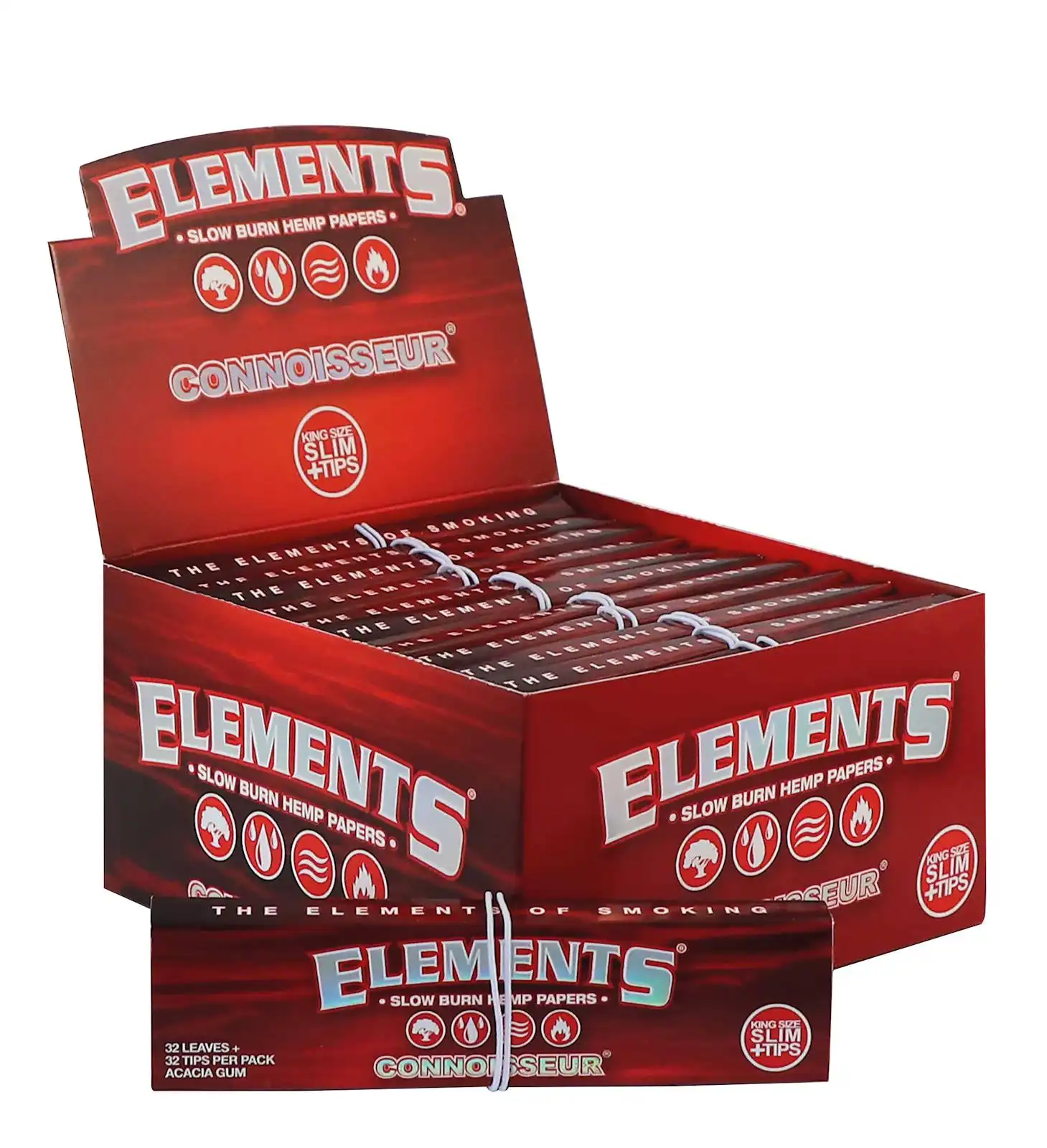 Beställ ELEMENTS RED CONNOISSEUR – KS SLIM + TIPS BOX-24 – 32 LEAVES direkt från Veloop.se – Sveriges pålitliga butik för rullpapper, tips och premiumtillbehör.