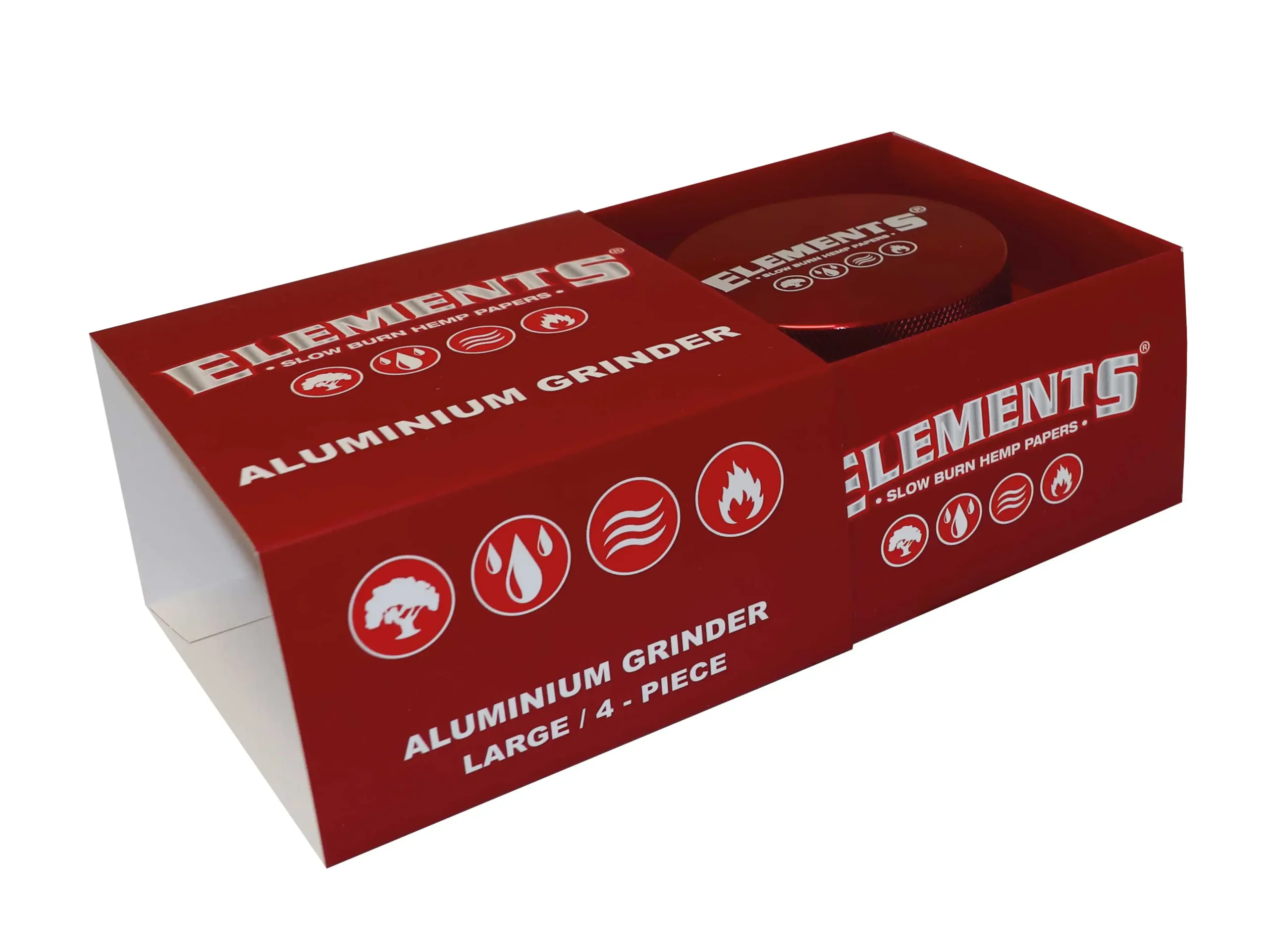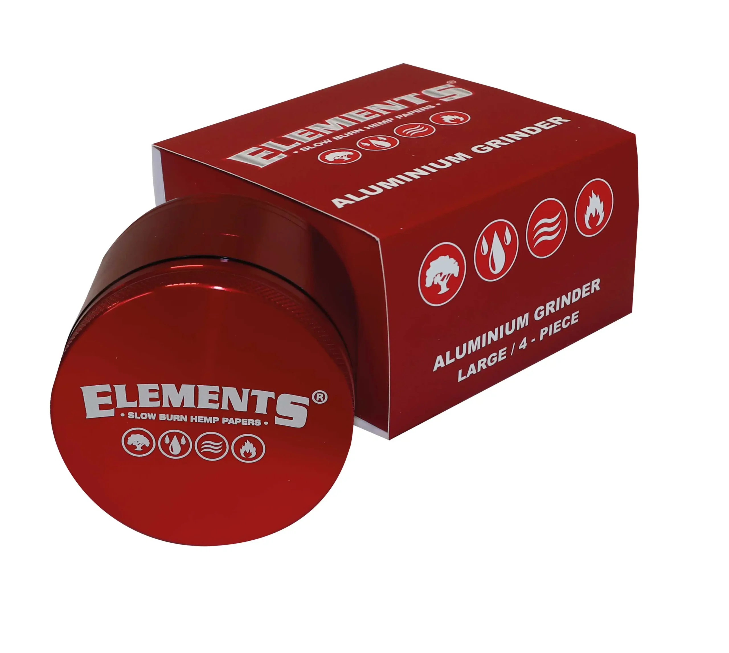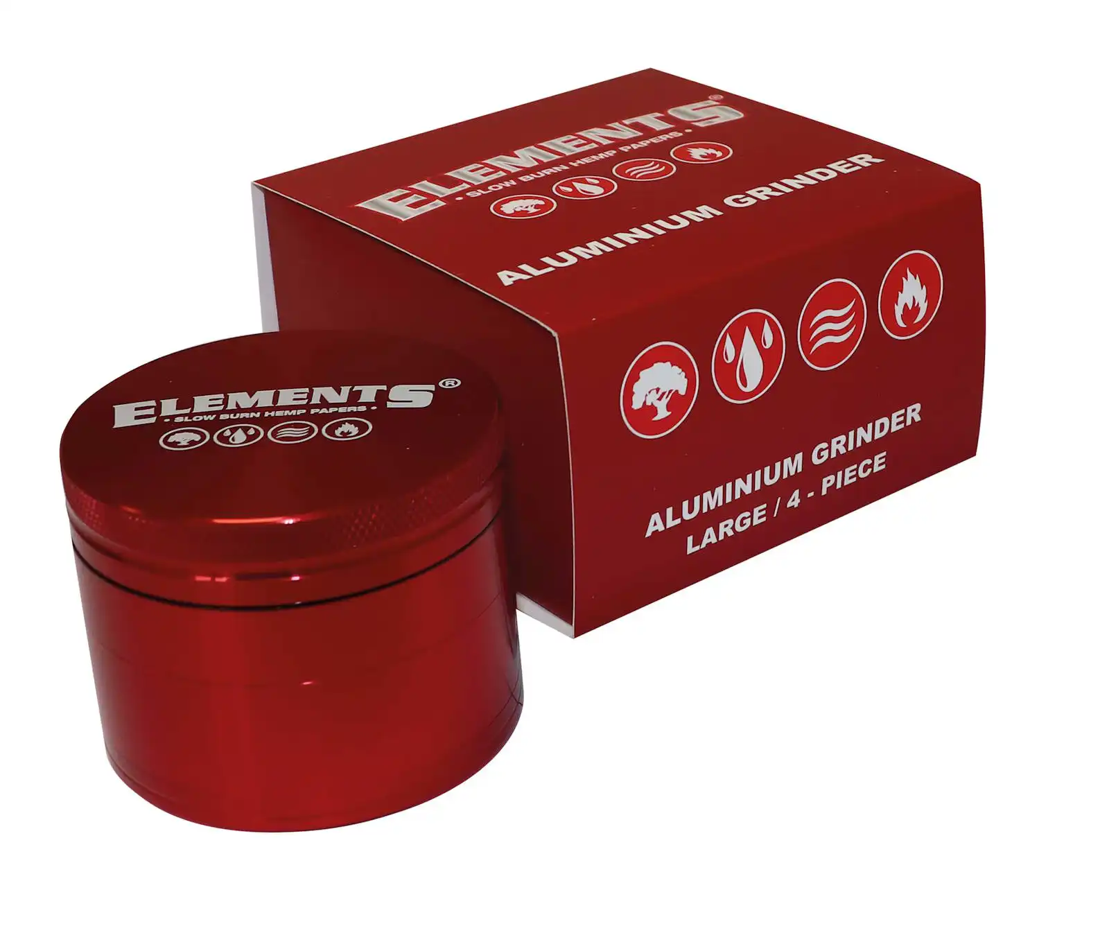 Beställ ELEMENTS RED GRINDER ALUMINIUM 4 PART LARGE direkt från Veloop.se – Sveriges pålitliga butik för grinders, rullpapper och premiumtillbehör.
